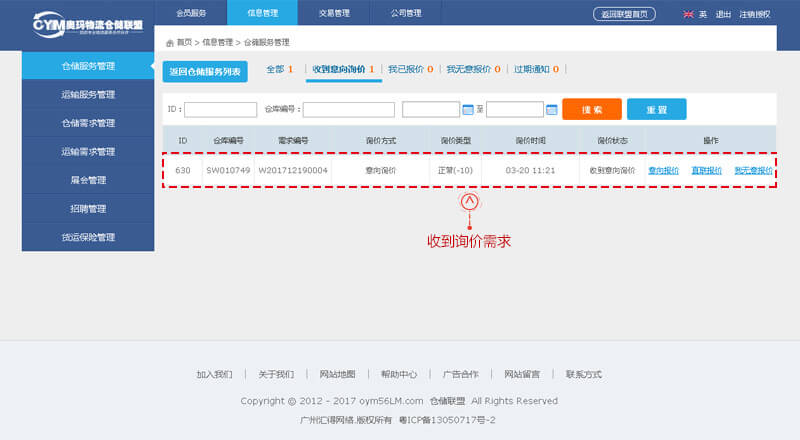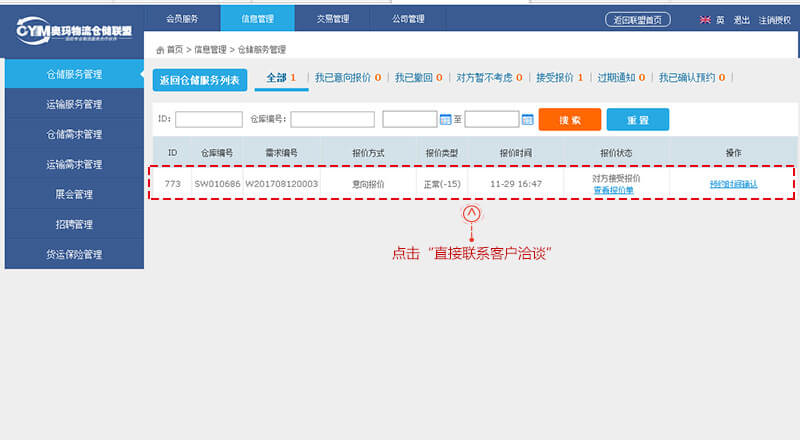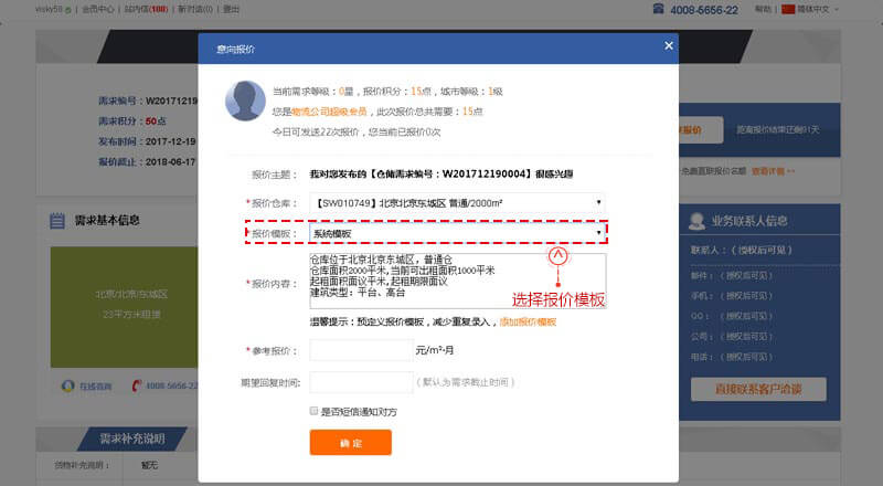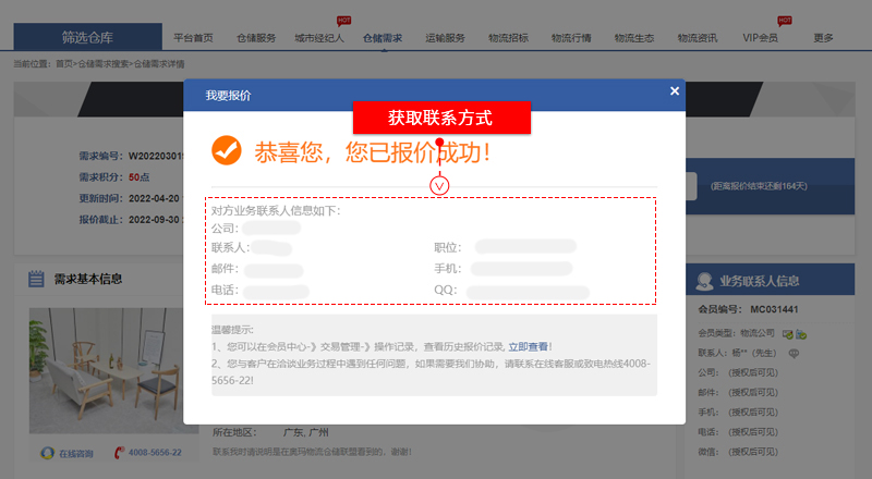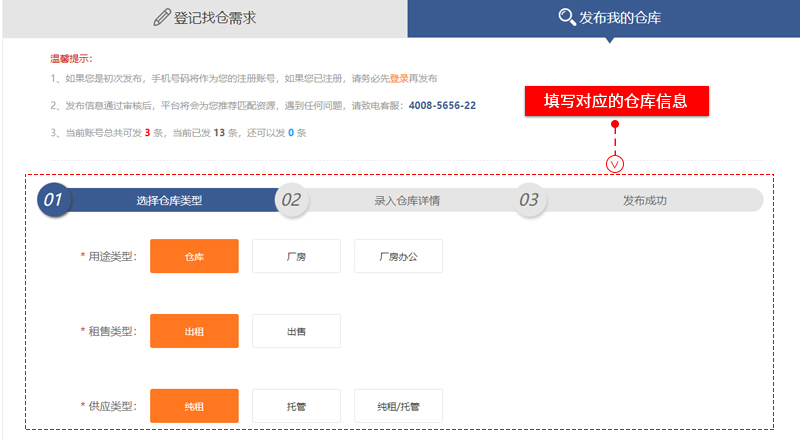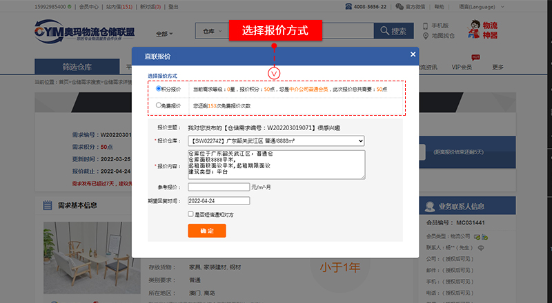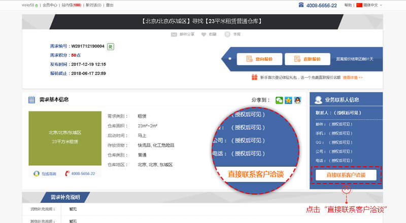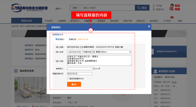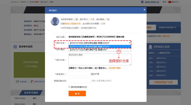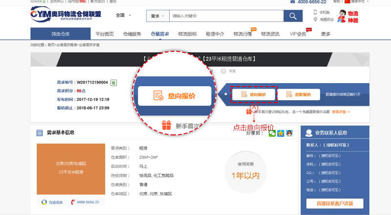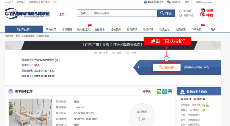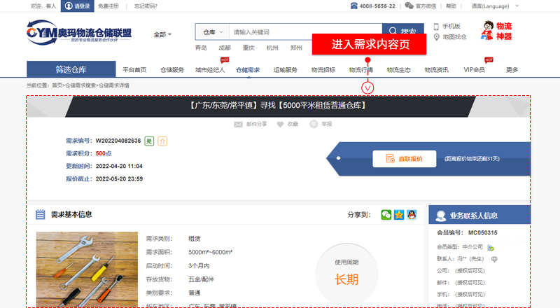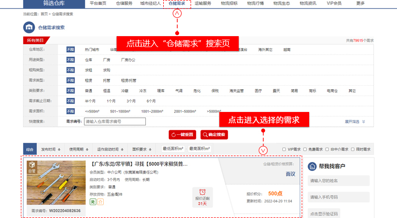 “倉(cāng)儲(chǔ)需求”搜索頁、點(diǎn)擊進(jìn)入選擇的需求