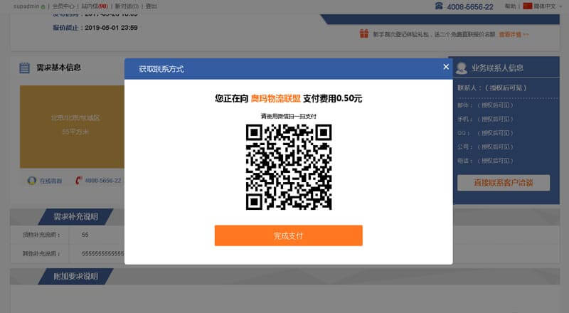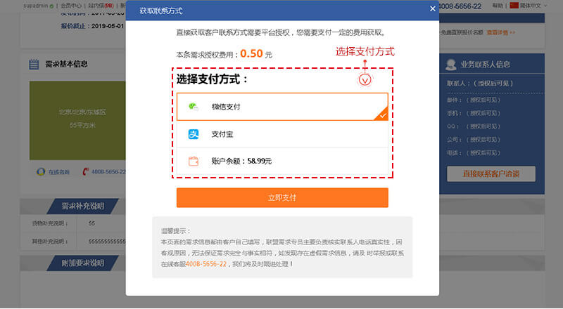 彈出獲取聯(lián)系方式支付窗口、選擇支付方式欄目
